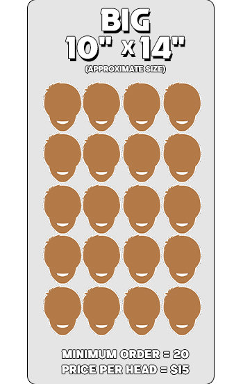 Everyone's head is shaped different which means that every BigHeadz Custom Cutout is going to have a unique shape and size within the space allowed. Results will vary based on the picture provided including image dimensions and quality (pixelization) of image. Inclusions of long hair, shoulders, hats, helmets, etc., will make the overall head smaller in size to fit in the size ordered.